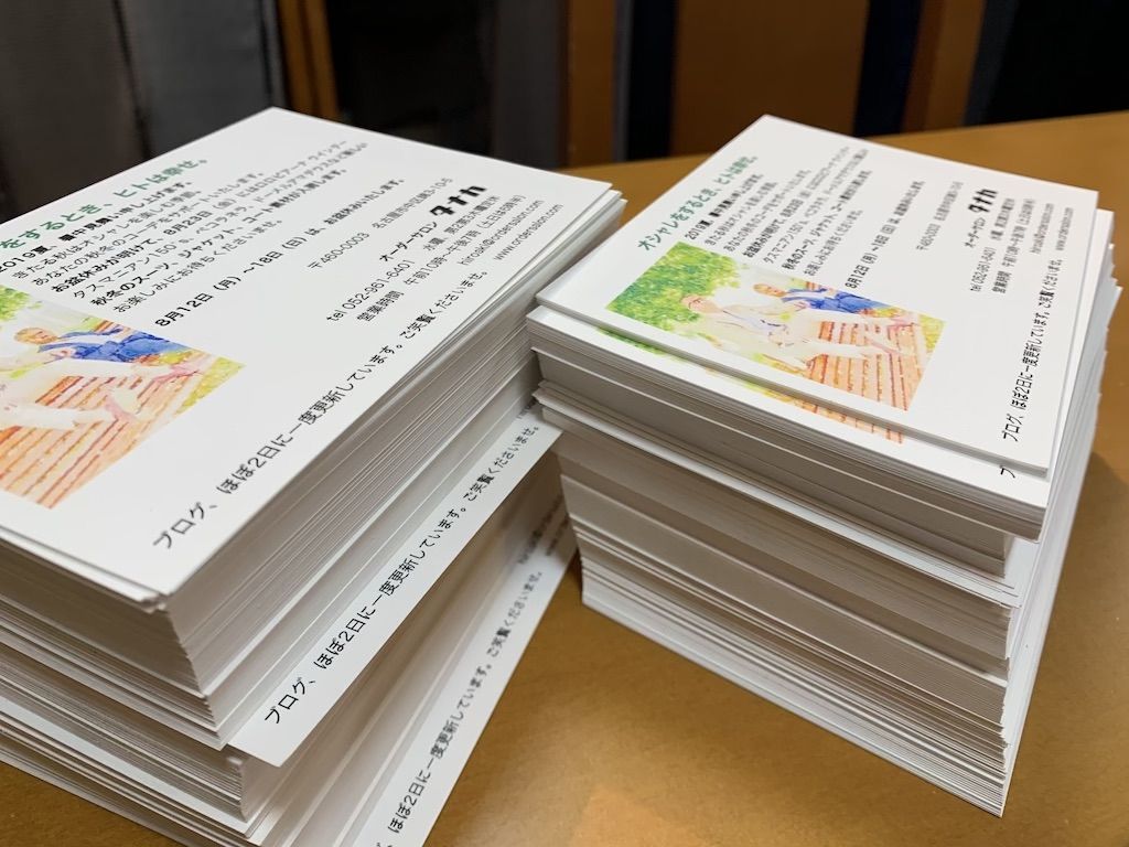 お盆休みのお知らせも兼ねて、この時期、いつも暑中見舞いを書きます。朝文面を考え、プリンターが壊れるかと思うほど印刷し、私、妻、マエストロと3人がかりでタックスールを貼りできました。一日で仕上がって嬉しいかぎり。住所録で出すお客様を抽出したら1000名になりました。ありがたいことです。お客様でもある郵便局員のNさんから700枚買っていたのですが300枚不足しました。Nさんにメールしたらすぐ持ってきてくれました。これまた有り難いことです。今からポストに出しに行きます。