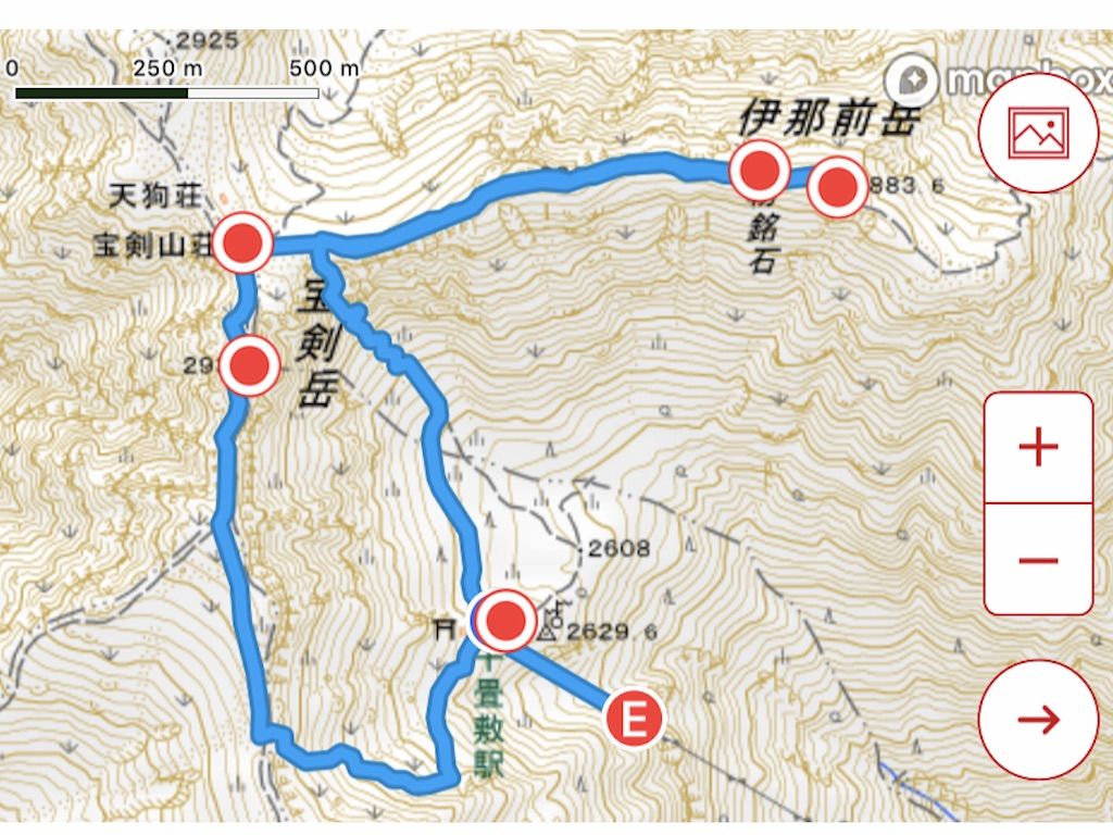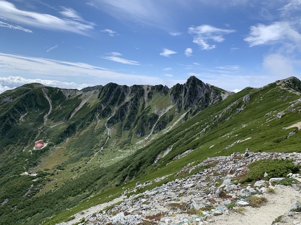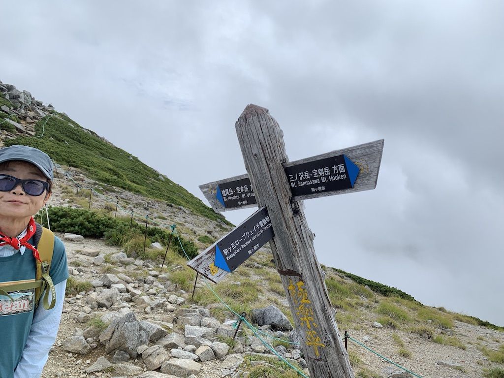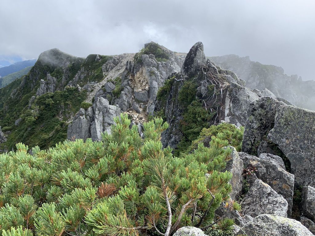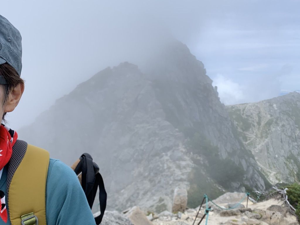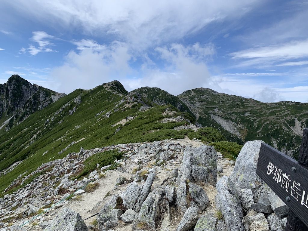 年前宝剣岳に登る際、妻が怖がっていたいたので心配したが思い切って宝剣岳へ。岩に記された丸印を頼りに宝剣岳を登るとあっけないほどかんたんに着いてしまった。そして前回はビビって岩の上に立てなかった妻も余裕で立ち上がっている。それじゃあ先に進もうと空木岳の方向に岩を下る。間隔が狭く丸印がついていると思ったら想像以上の難所。頻繁に鎖場があったり、丸印がないと思ったら巨石をくぐった先にあったり。すごい景色なので写真を撮ろうとすると妻が立ち止まると恐怖心が湧くので止まらないでと懇願する。だんだんガスも湧いてくると同時にほんとうに着けるのか不安が頭をもたげる。目の前の岩山はほぼ垂直に向かっていてそこに鎖が垂れている。ここをほんとに登るのか自信がだんだん不安に変わっていく。でも登山はアドベンチャーではなく安全を考えて登山道が整備されていると信じ、前に向かって岩を越えていくと向こうのなだらかな尾根に人の姿が見えてきた。岩山を越えるとそこはウソのようになだらかな尾根道。しばらく行くと千畳敷カールをロープウェイ乗り場に降りる道の分岐点に出た。