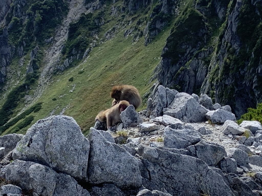 温泉に入ってゆっくりしながら次の日の予定は朝起きて決める。くもりの予報のはずが快晴で、駒ヶ岳に登ることに。バスとロープウェイを乗り継いでそれから1時間急坂を登れば山頂周辺区域である乗越浄土。とはいえ登山用の靴を履き、雨の用意と緊急食糧を持った上登山計画書を提出。なんちゃって登山ではあるが登山は登山である。なれているので汗もかかず乗越浄土に着くと3000m近い標高なので空気は澄みきっている。いつもここから主峰駒ヶ岳の頂上を目指すが今日は主峰と反対側の尾根道を選んでみた。左が木曽谷、そして右は切り立った千畳敷カールの尾根道を歩くと猿の群れにであう。そうですここはもともと人間ではなく猿やくまや鹿や鳥、野生生物の住む場所。サルの家族が人を恐れもせず木の実などを食べる姿が可愛く、ずっとここが彼らの土地であることを祈る。足も快調で伊那前岳までほどなく到着。そこで喰う握り飯の上手いことったら。まさかこれがセブンで買ったものとは自分でも信じられない。