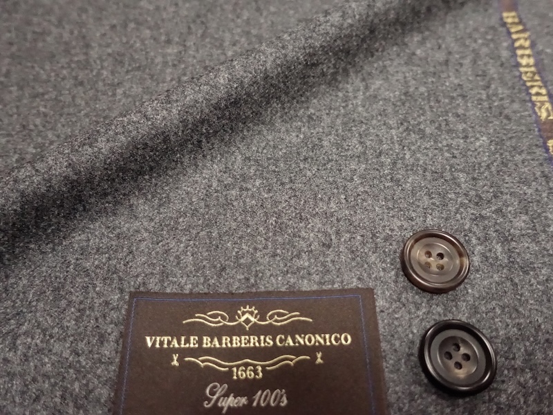 この時期のスーツと言えばフランネル。今年もイタリアで最古の毛織物工場のひとつであるヴィターレ・バルベリス・カノニコ社のウールンフランネルのミディアムグレー無地とダークネイビー無地の2種が入荷しました。このフランネルは1mあたり340gと十分な目付けがある上、品質の良いウールを使っているため、ウールン(紡毛)特有の柔らかな手触りで定評のある素材です。特にフランネルスーツの代表的な色であるグレーは糸のレベルでランダムに染色するビコロ製法によりグレーフランネル必須のメランジェ感を醸し出しています。