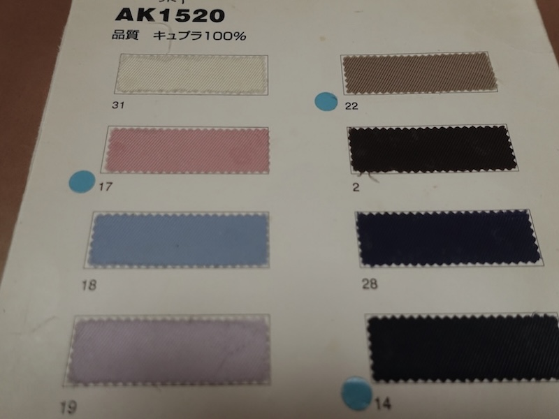 キュプラ100%ツイル無地 AK1520については全色復活したわけでなく水色の丸印がついた17ピンク 22ベージュ 14ダークネイビーのみの復活となります。17ピンクは人気が高い色ででしたのでこの復活も朗報です。