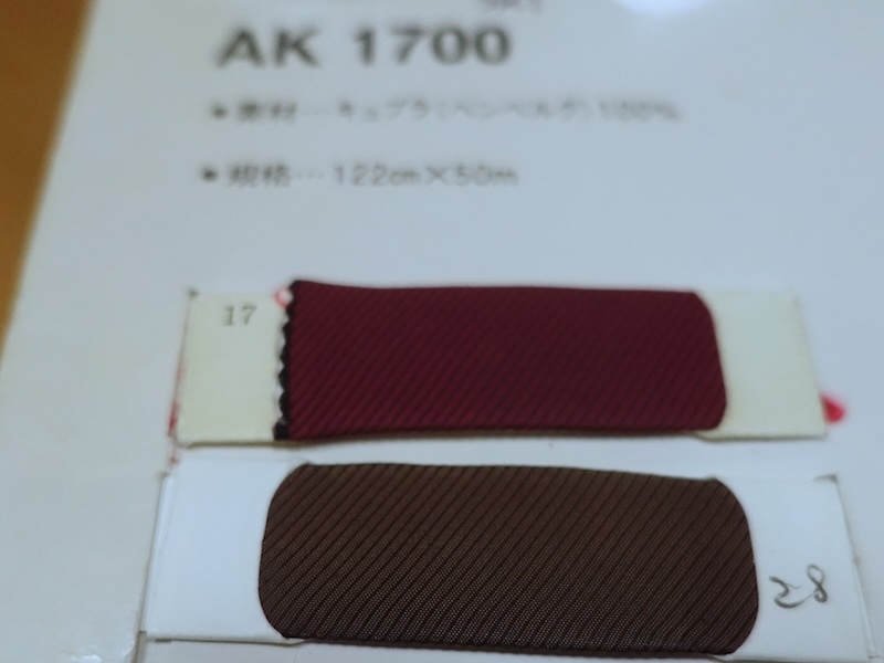 ダイアゴナルのような斜めの綾目が見えるAK1700はセレクトショップのスタッフにも人気の高いキュプラ100%裏地です。17ワインレッドと28ブラウンの復活です。
