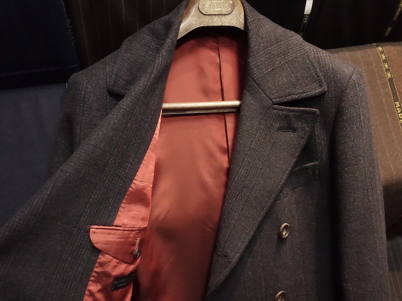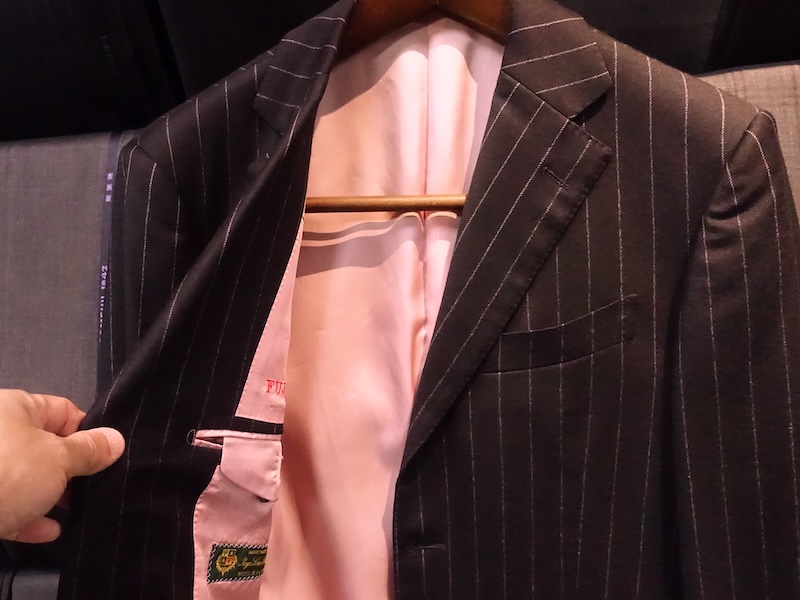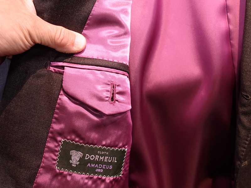 実際の裏地の画像です。ポリエステルの裏地のものと比べると着心地は全く違います。この違いは洋服に慣れていない人でもすぐわかるほど。見た目もごらんのようにエレガント。裏地は取り替えることができませんのでキュプラ100%一択には必然性があります。