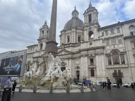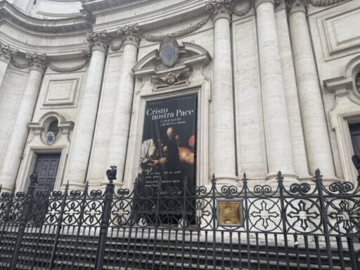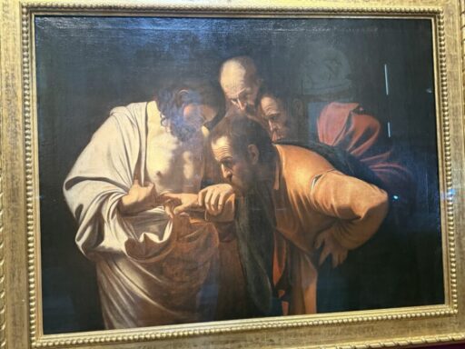 マドリードから戻った先は、最終目的地のローマ。母からサンタマリアノッヴェラのオーデコロンを頼まれ、フィレンツェでは買えなかったので、サンタマリアノッヴェラのローマ支店に朝10時出かけました。その店はナボーナ広場のすぐ近く。ベルニーニの名作四大河の泉の前の聖アニェーゼ教会になんとカラバッジョの展示のお知らせの垂れ幕がありました。さっそく教会の中に入るとすぐカラヴァッジョの絵が展示されていました。これはポツダムのサンスーシ教会に飾られている作品「聖トーマスの懐疑」この絵は復活したキリストを聖人トーマスが疑って、そのキリストの十字架での傷口に指を入れると言うちょっと残酷な瞬間を描いたものです。