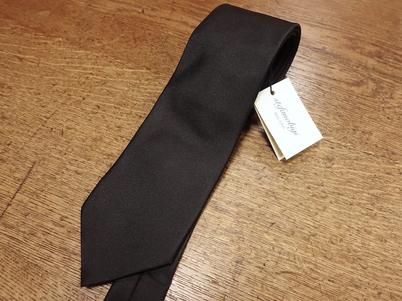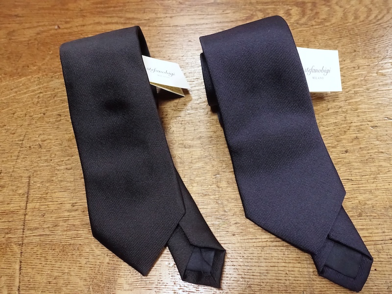 今回背の高いお客様用にロングタイプのネクタイをご用意しました。通常145cmで85cm巾ですが、おなじ8.5cm巾で約9cm長い154cmのロングタイプのネクタイもステファノビジさんにお願いして仕立ててもらいました。価格は通常の長さと同じです。ネイビー無地、ダークネイビー無地、フォーマル用にブラック無地もご用意いたしました。数量限定となります。
