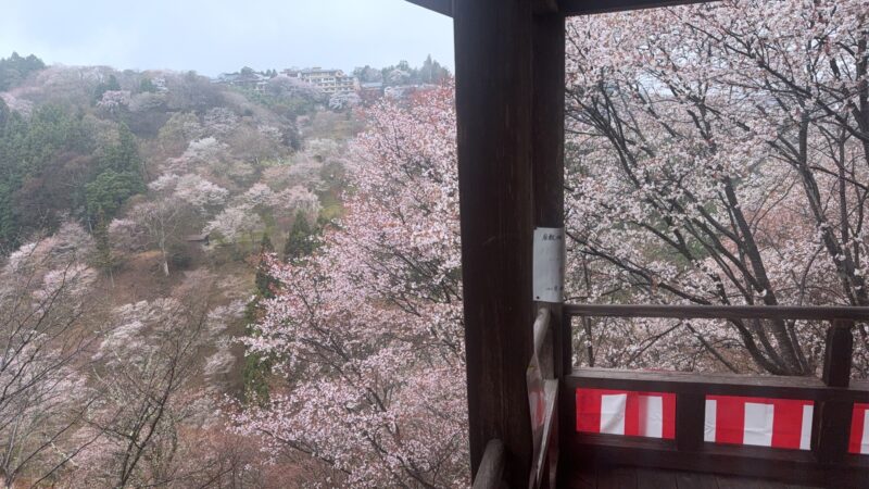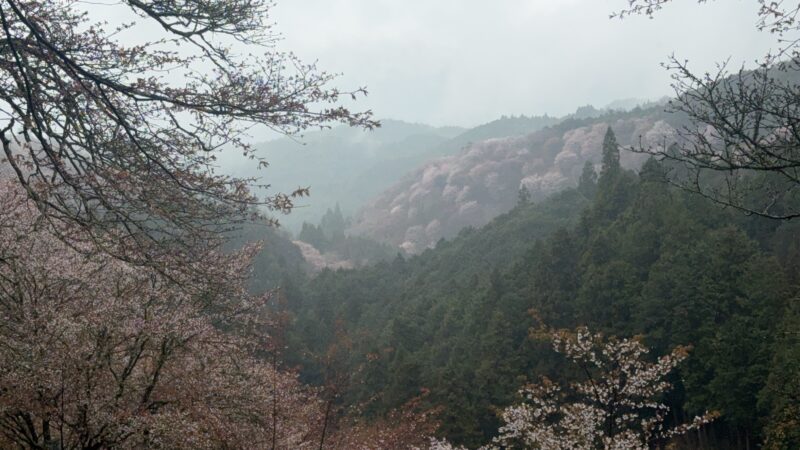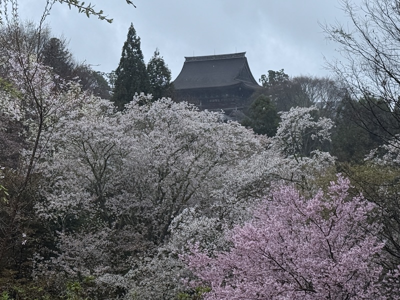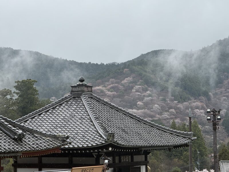 でもわれわれは吉野の山歩きの楽しさを知っています。脇道に逸れて後醍醐天皇の墓所のある如意輪寺に向かいます。ここは吉野のメインストリートから谷ひとつ隔てた名刹。南北朝の悲劇の舞台でもあります。ここからの桜はまさに雅な景色で、変な事情で来なくなった国の人もいませんし、そもそも雨で人が少なくこんなゆったり吉野の桜を愛でられるのはまさに眼福です。